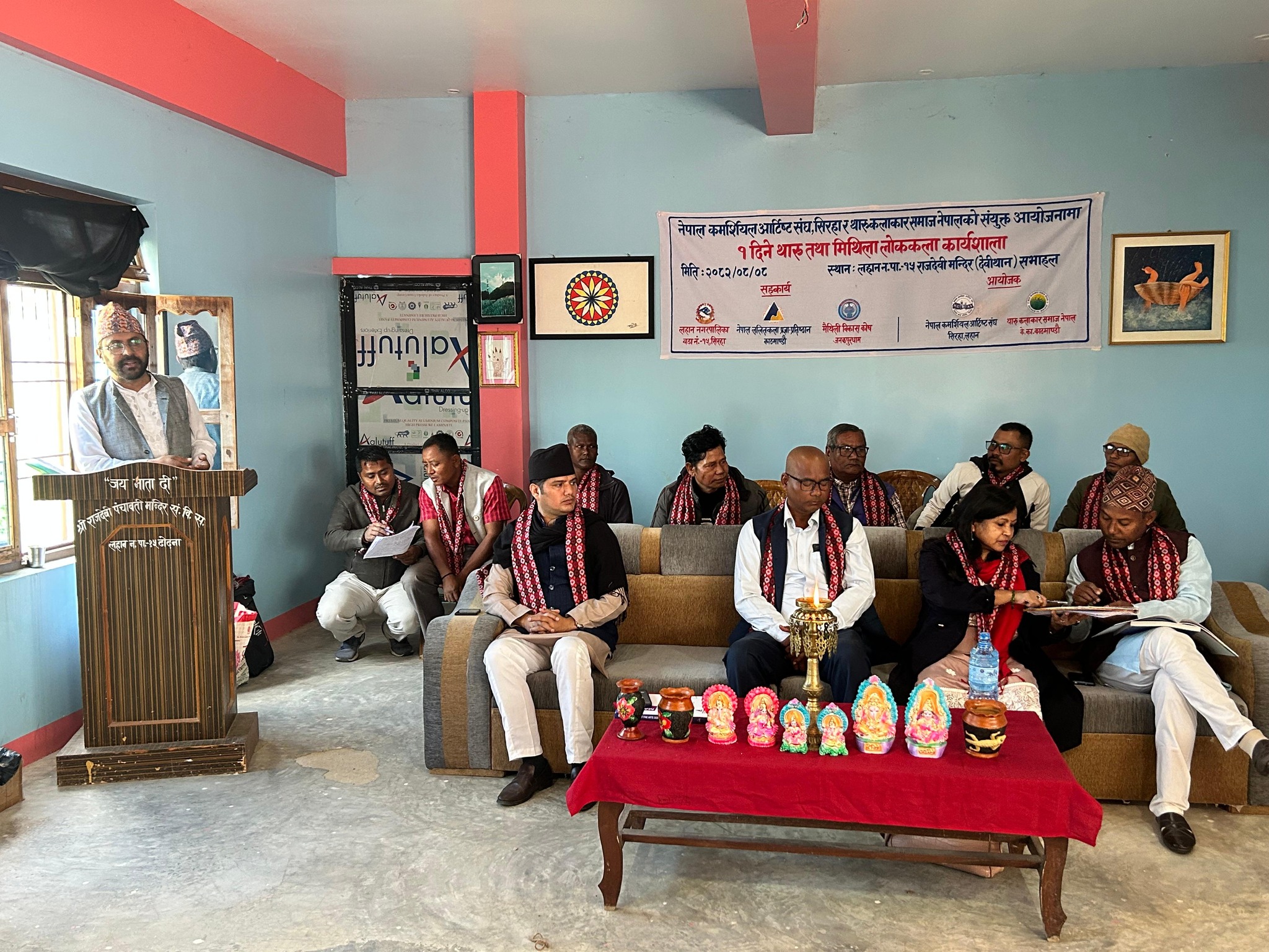नेपाल ललितकला प्रज्ञा–प्रतिष्ठान, वास्तुकला तथा लोककला विभाग तथा मधेश प्रदेश समन्वय समिति र मैथिली विकास कोषको संयुक्त आयोजनामा आइतबार (२०८२ मङ्सिर ७ गते) मैथिली भवन, जनकपुरधाममा ‘ललितकला विषयक अन्तरक्रिया तथा मिथिला लोककला कार्यशाला २०८२’ सम्पन्न भएको छ । मैथिली विकास कोषका अध्यक्ष जीवनाथ चौधरी सभाध्यक्ष तथा मधेश प्रज्ञा–प्रतिष्ठानका अध्यक्ष रामभरोस कापडि भ्रमर प्रमुख अतिथि रहनुभएको कार्यक्रममा प्रतिष्ठानका शिल्प–हस्तकला विभाग प्रमुख तथा मधेश प्रदेश समन्वय समिति संयोजक अरुणा हिङमाङ, वास्तुकला तथा लोककला विभाग प्रमुख प्रदीप अधिकारी, राजर्षि जनक विश्वविद्यालय अनुसन्धान केन्द्र, जनकपुरधामका निर्देशक प्रा.डा. राम खेलावन साहलगायतको उपस्थिति रहेको थियो । कार्यक्रममा प्रतिष्ठानका सदस्य सचिव देवेन्द्रकुमार काफ्ले ‘थुम्केलीले ललितकलाका विषयमा पावरप्वाइन्टमार्फत प्रस्तुति दिनुभएको थियो । साथै, मिथिला लोककला कार्यशालामा ३५ जना कलाकार सहभागी हुनुहुन्थ्यो ।